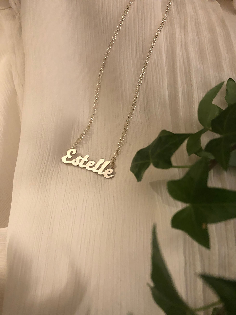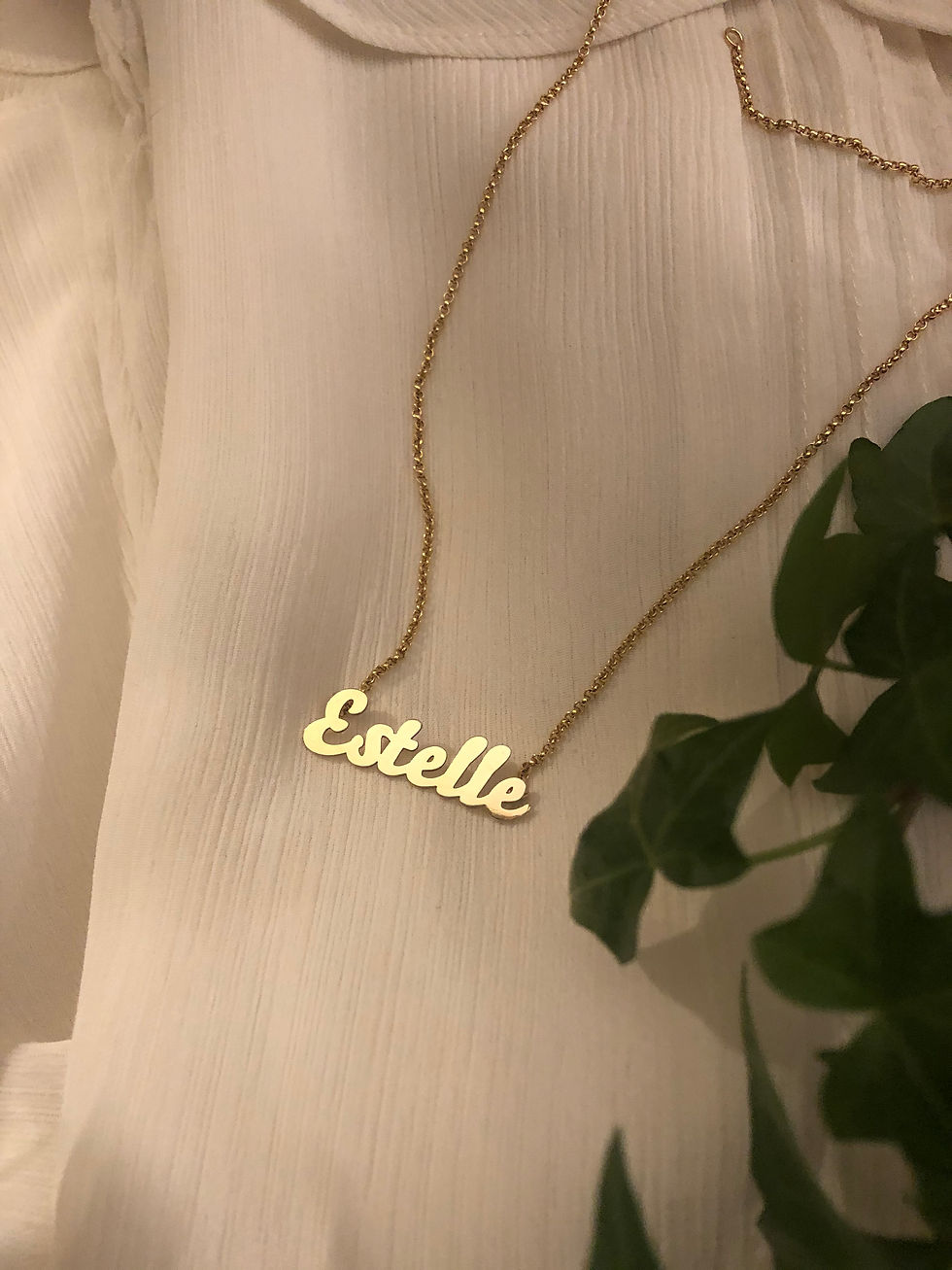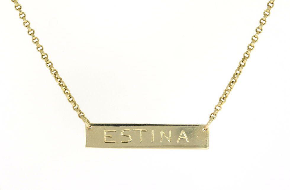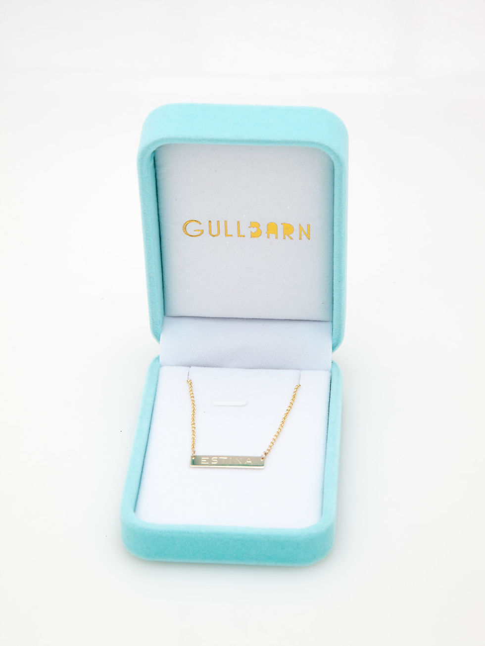 Det første smykket pappa laget til meg etter at min datter var født, var et gullanheng med en plate. Navnet til Estina ble gravert inn på platen og dette smykket har jeg hatt på meg omtrent hver dag siden. Dette har også raskt blitt en av våre bestselgere da dette er en nydelig gave enten til mor, din partner eller til deg selv.